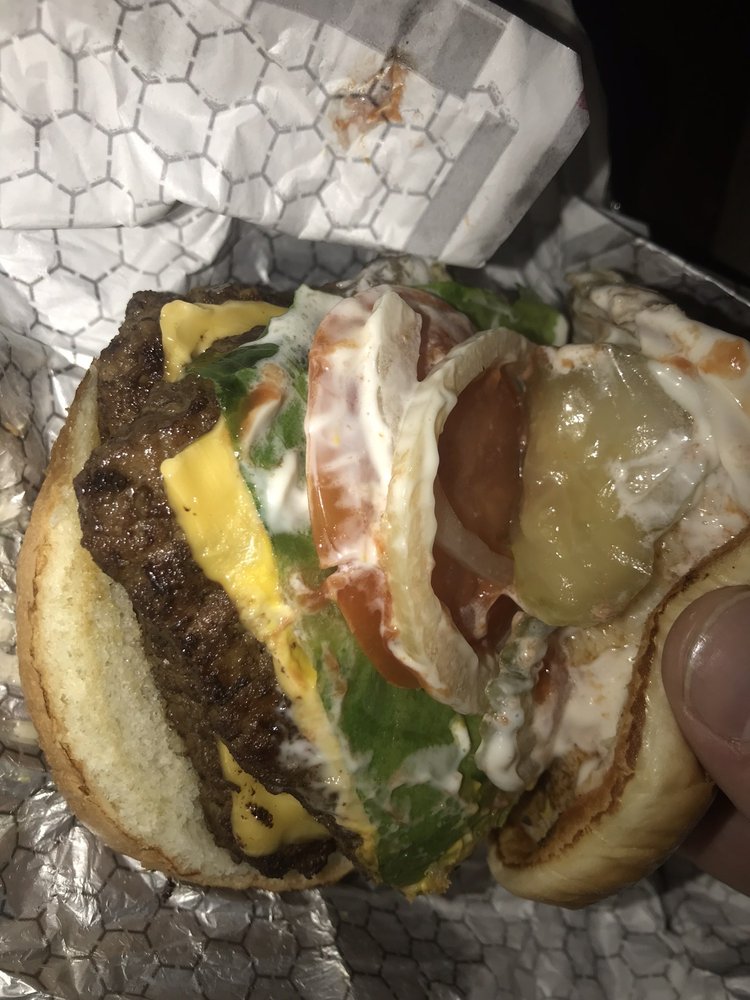 Three quarters of a pound of fresh beef, American cheese, crisp lettuce, tomato, pickle, ketchup, mayo, and onion on a toasted bun. Use both hands!